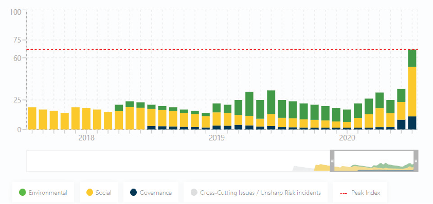 Boohoo’s RRI reaches RepRisk’s high risk category (RRI 67 in July 2020).