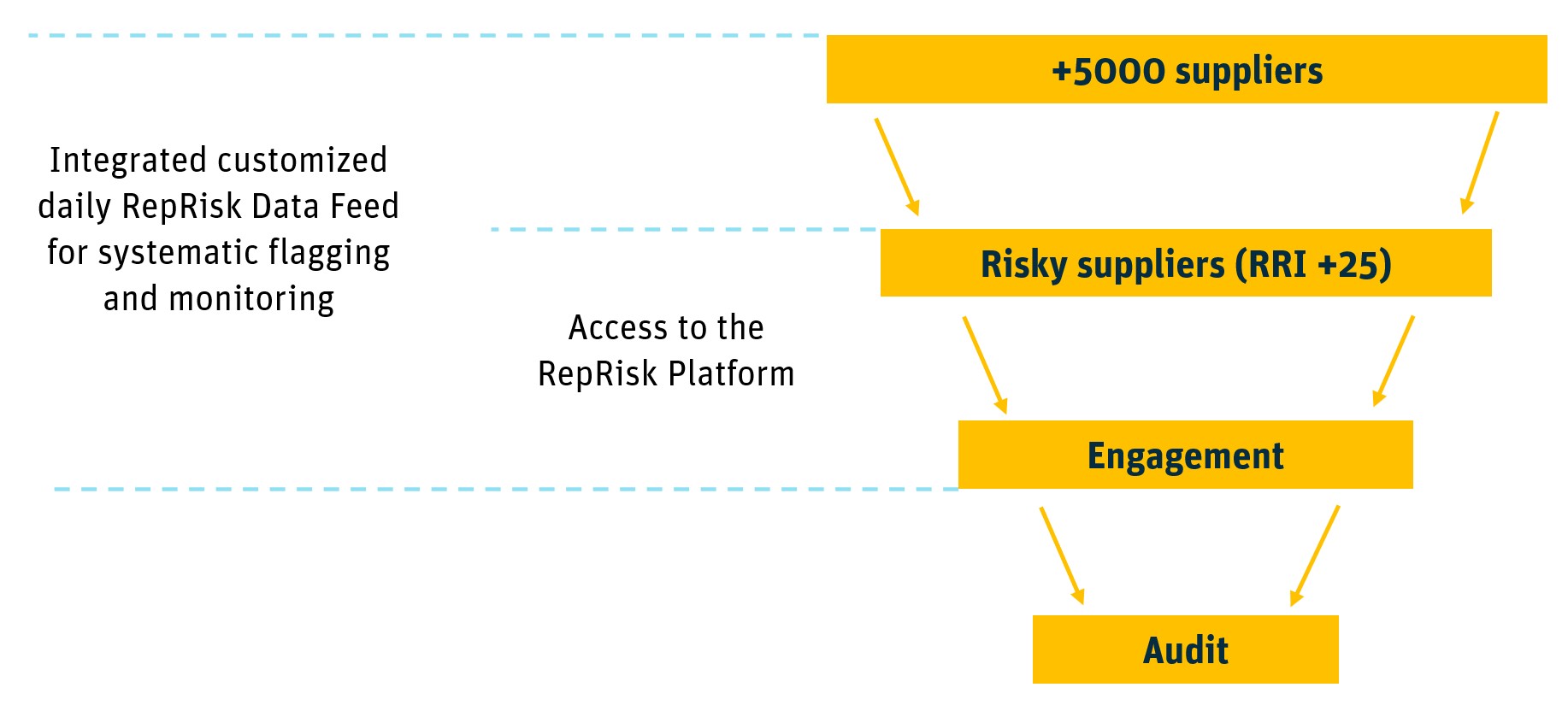 - Automate daily risk screening: RepRisk’s data feed systematically flags and monitors suppliers, ensuring that those with a RepRisk Index (RRI) above 25 are automatically identified for additional due diligence.