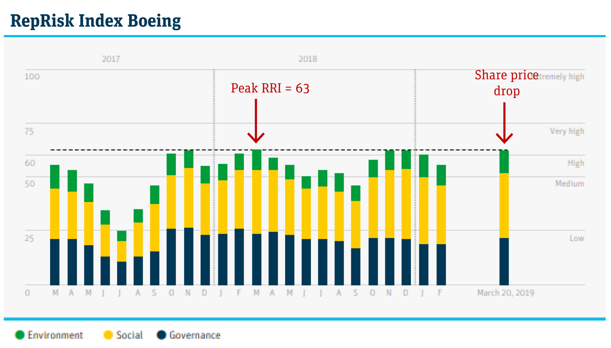 RepRisk’s unique research approach and methodology picked up early warning signals around the high environmental, social, and governance (ESG) risk exposure of Boeing before these two tragedies occurred. The company’s high Peak RRI1 score in March 2018 had been triggered by a series of allegations and risk incidents that already raised serious concerns about the business conduct of the company.
