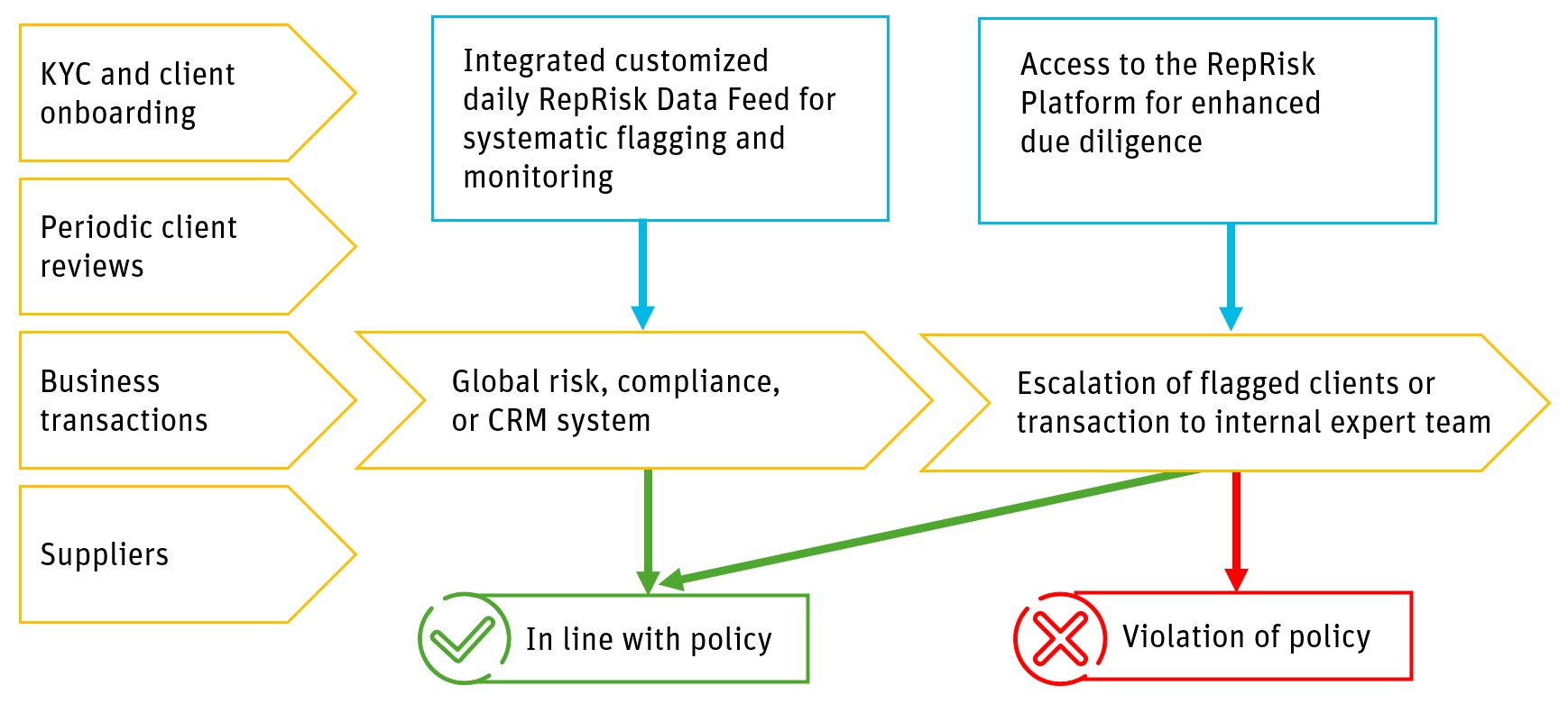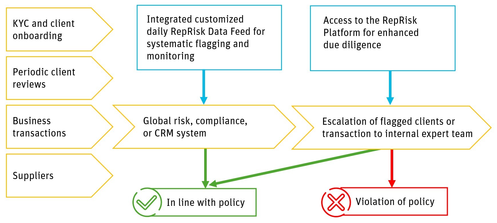 To address these challenges, the bank integrated RepRisk’s data feed into its internal compliance and risk management tools, creating an automated and standardized ESR review process. Key elements included: