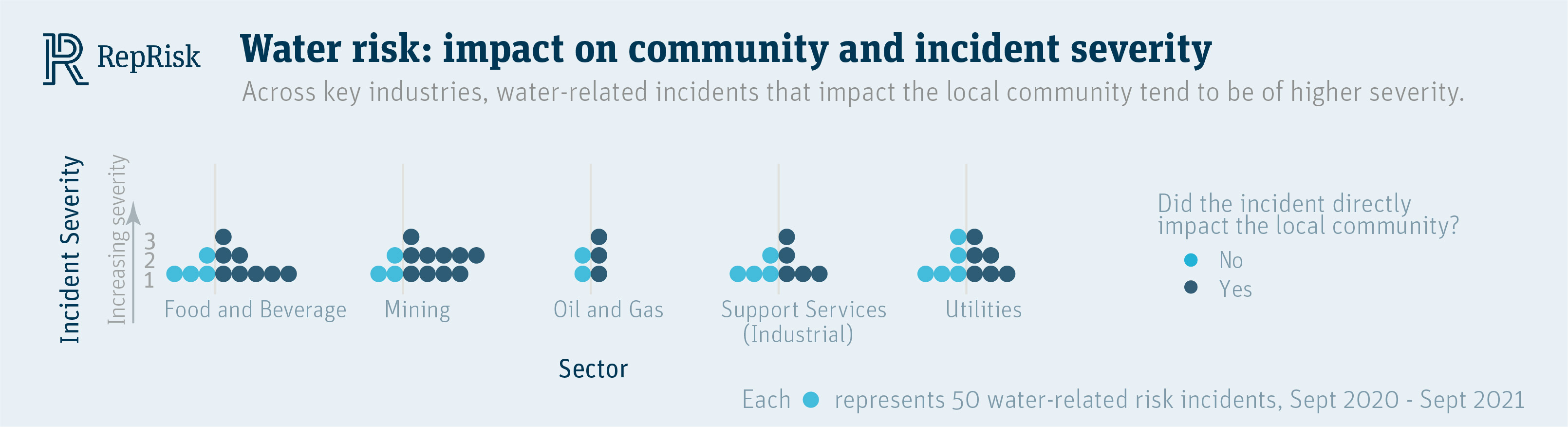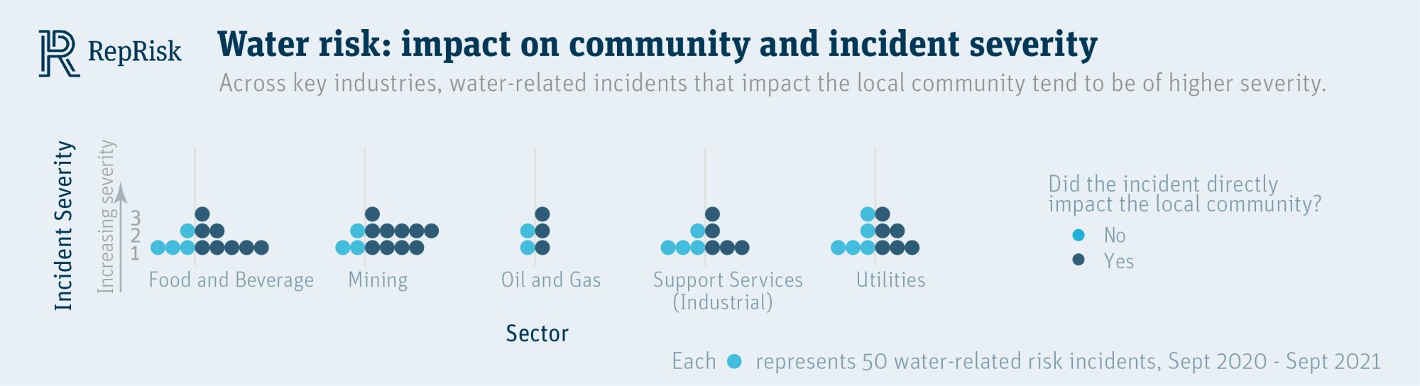 Water is an essential resource for all people and nature. Mismanagement of water and pollution of local water sources often impacts not only ecosystems, but also local communities. 65% of recorded water risk incidents in the past two years also had a direct impact on the local community. When water incidents have an impact on the community, they are often more severe - on average by 23%.