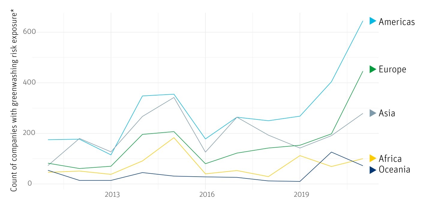 # IV. Greenwashing risk escalating for companies headquartered in Europe and the Americas