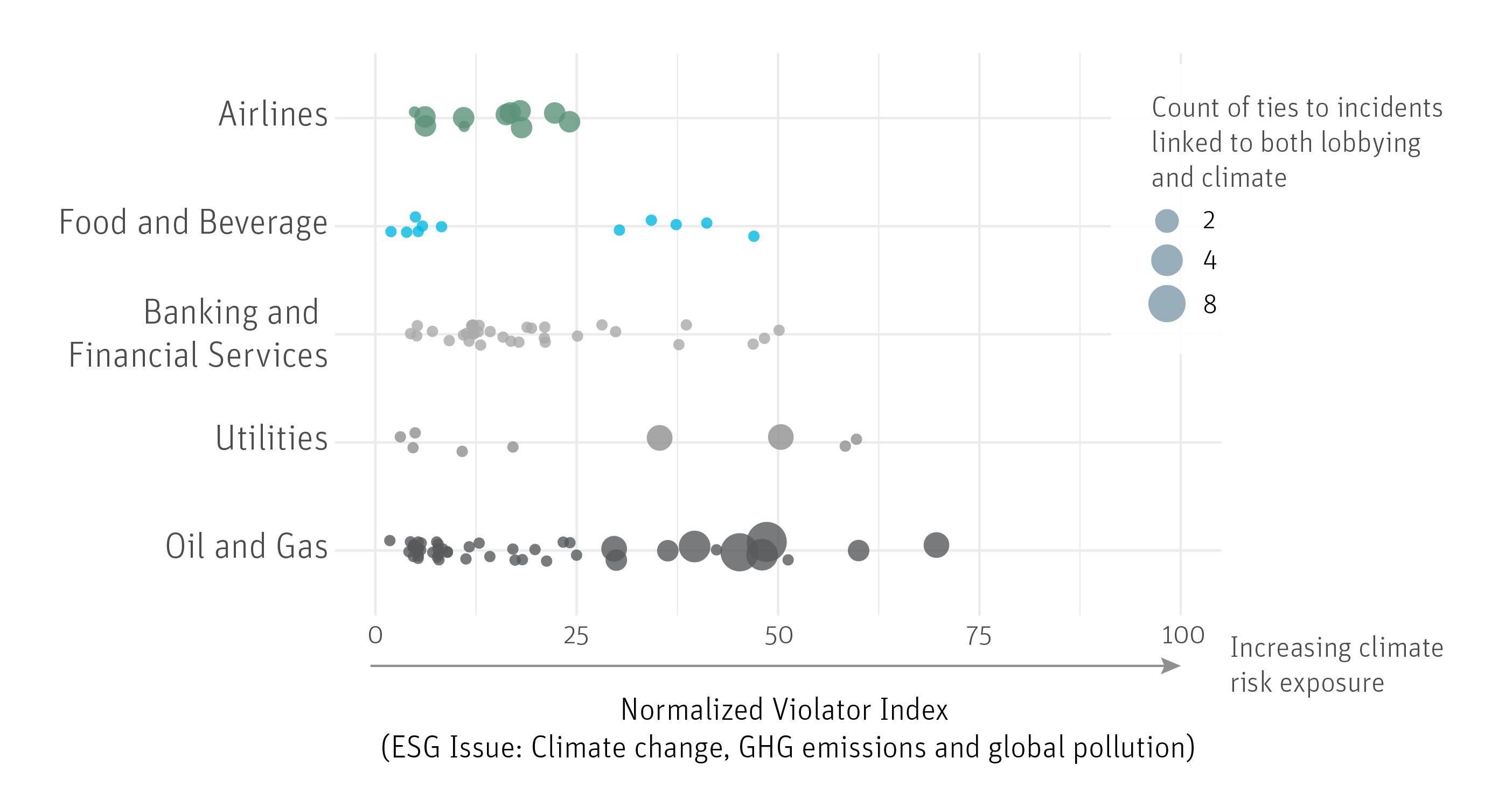 Climate change, GHG emissions, and global pollution Violator Index for 116 companies linked to at least one incident of climate lobbying in the past two years.