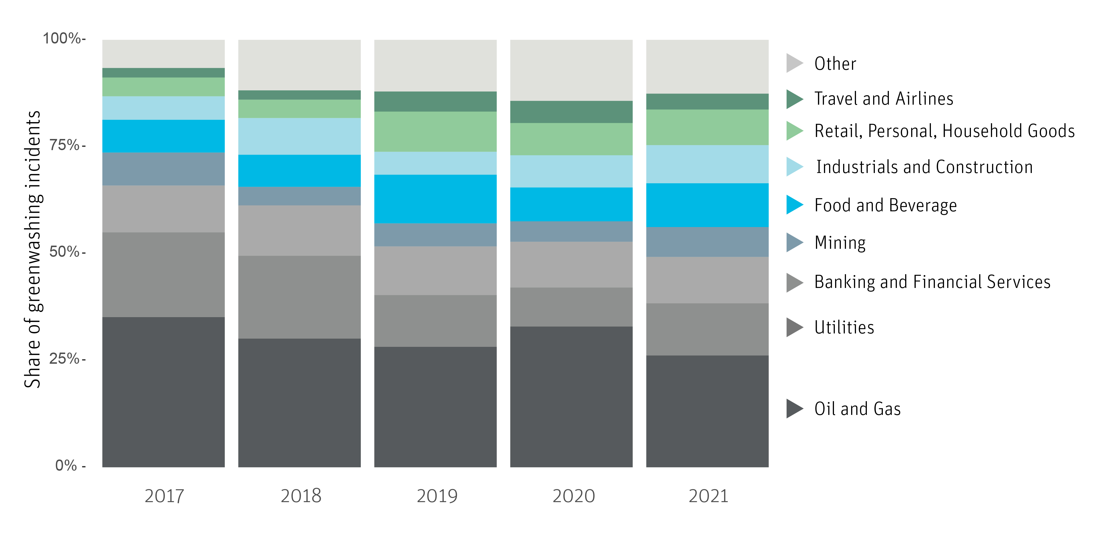 To better understand what is driving this increase in the prevalence of climate-related greenwashing over the past five years, we reviewed how the distribution of contributing sectors has changed.