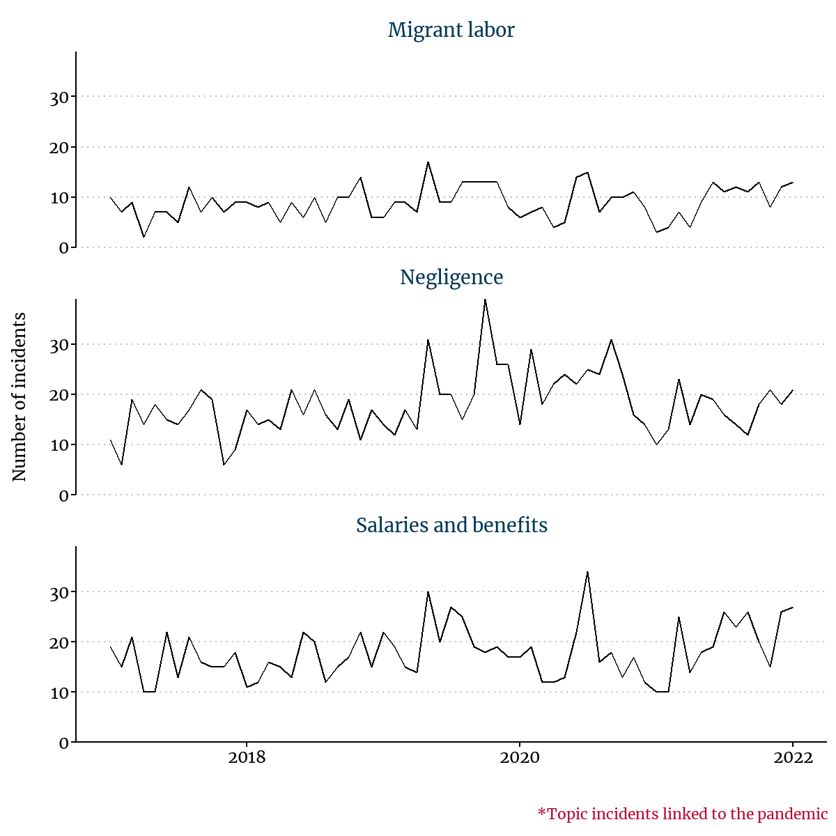 Digging deeper into three prominent topics discussed above, migrant labor, negligence, and salaries and benefits, the chart below details the evolution of these topics over the past five years, split by whether incidents were also linked to the pandemic.