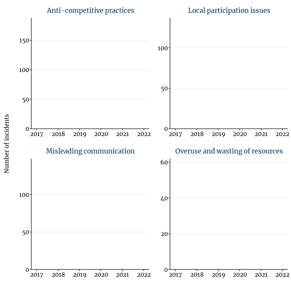 Impacts of the pandemic were first seen in connection with intrinsically associated issues, such as occupational health and safety. As the pandemic demanded collective attention on one issue, this focus may have given way to a faltering in the prevention and mitigation of other issues – for this reason, we looked more closely at the development of four key ESG issues over the past five years: anti-competitive practices, local participation issues, misleading communication, and overuse and wasting of resources.