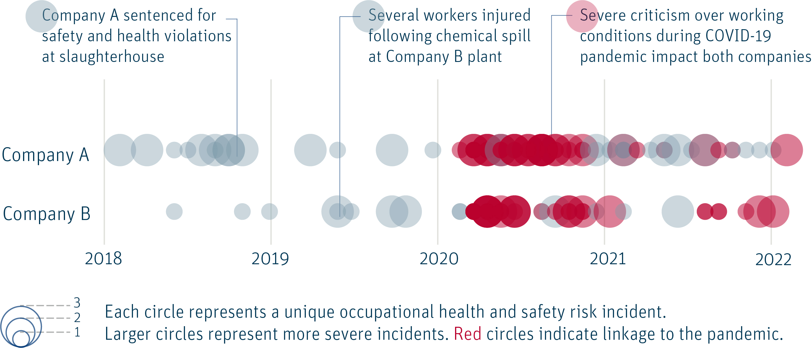 Our data shows that both companies saw several occupational health and safety risk incidents in the years leading up to 2020, with a handful of these being severe. When the pandemic struck, these vulnerabilities were accentuated. For Company A, a higher risk incident count before the pandemic translated into a period of consistent severe risk incidents throughout 2020.