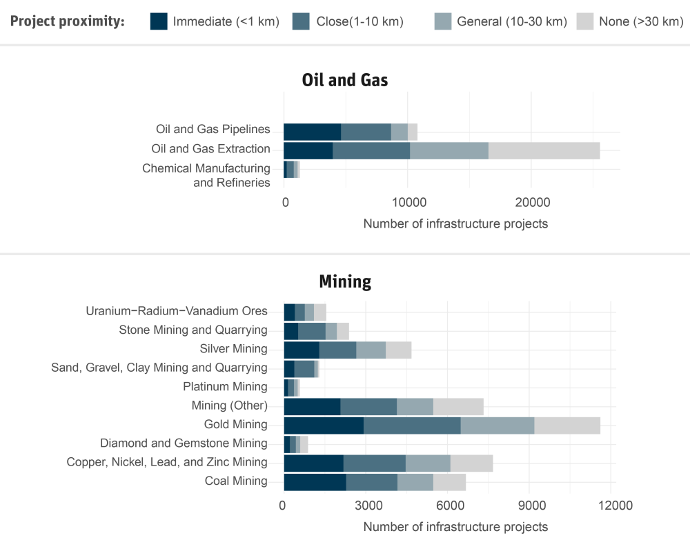 Different project types have different physical footprints and other considerations, impacting their placement. In the oil and gas sector, for instance, the majority of pipelines weave in or near at least one environmentally sensitive site, while other types of extractive projects like mines generally have more contained operations. Figure 1 below shows the proportion of projects in each category that fall within the different Proximity Levels.