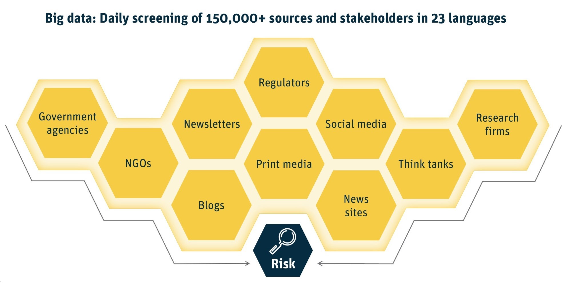 RepRisk screens, on a daily basis, over 150,000 public sources and stakeholders in 23 languages.