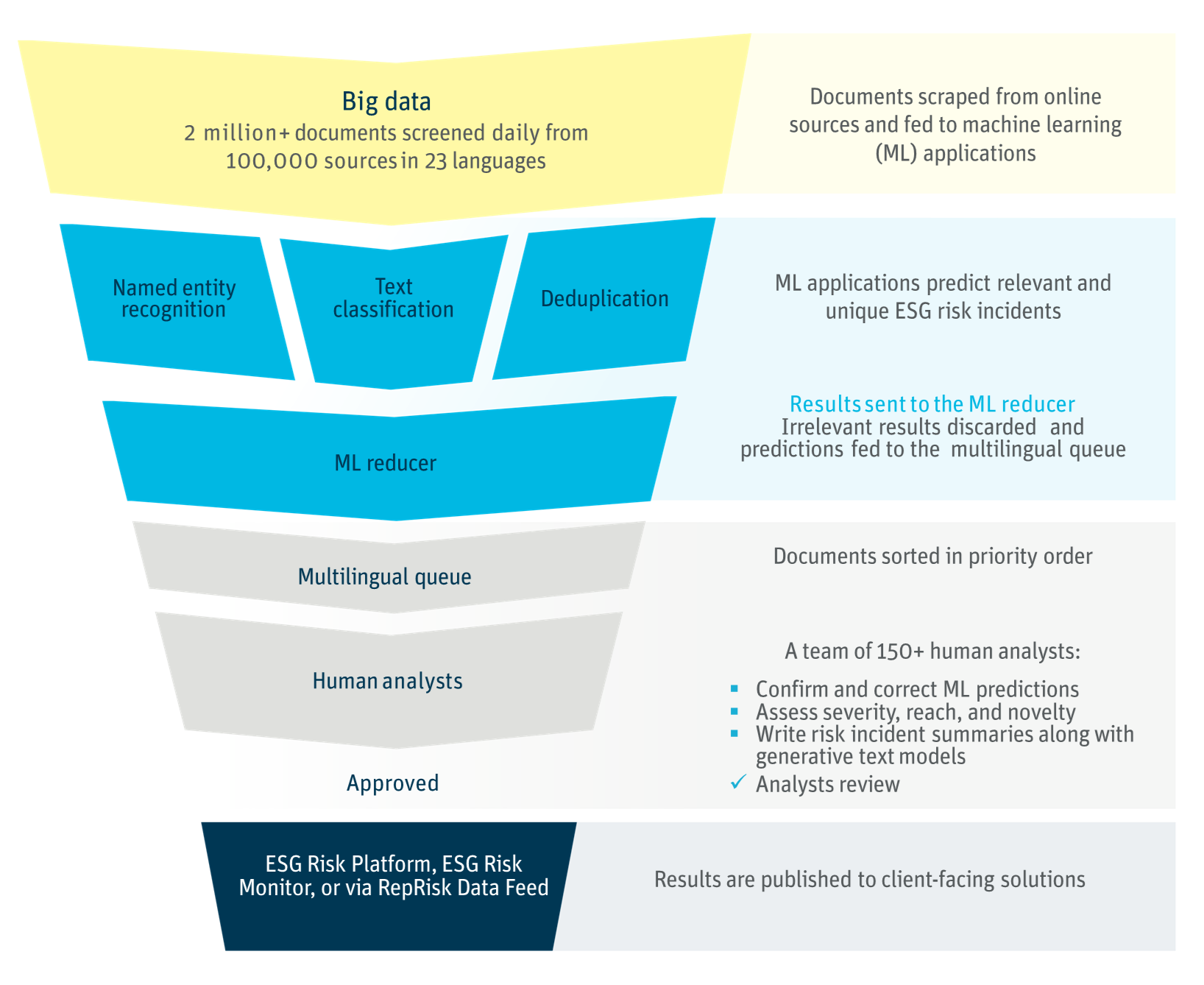 From vast amounts of data – 2,500,000+ documents screened daily from 150,000 sources in 23 languages – RepRisk uses machine learning models to identify and classify ESG-related risk incidents consistent with definitions from key international standards and norms. Documents that contain relevant ESG and business conduct risk information are appended with machine learning predictions and submitted for human analysis according to a proprietary logic that ensures the most relevant information is reviewed first.