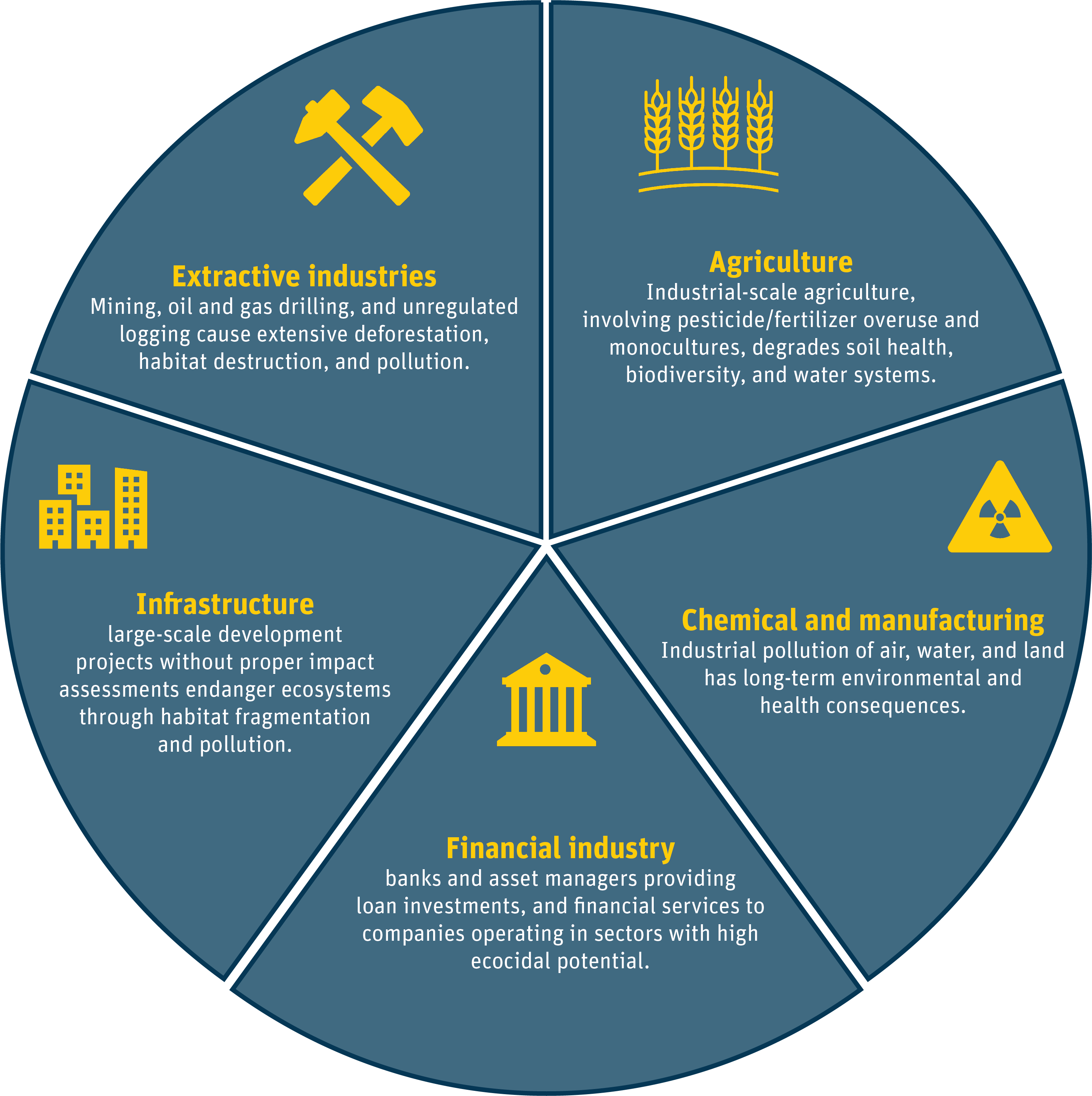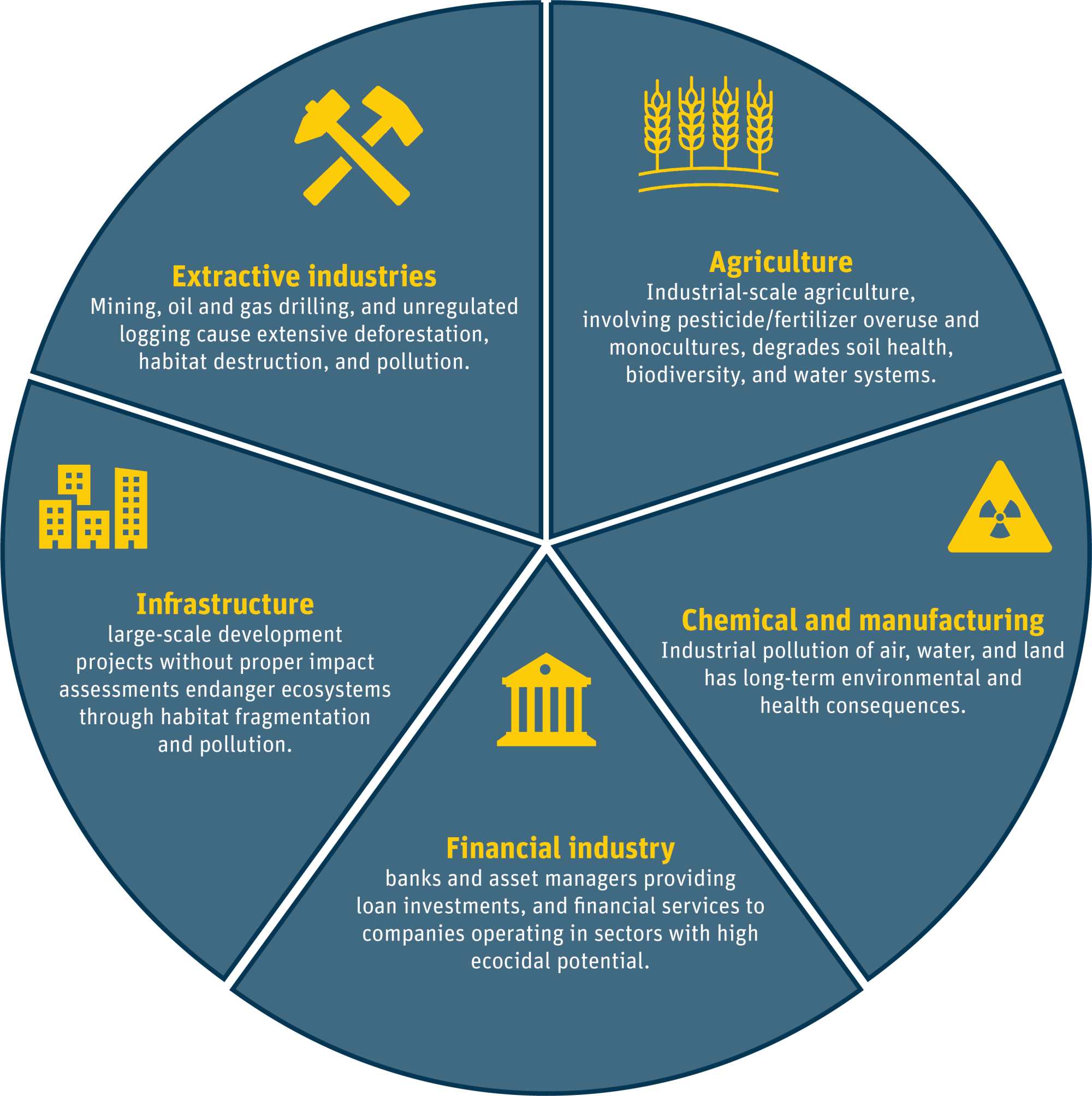 - Financial industry – banks and asset managers providing loan investments, and financial services to companies operating in sectors with high ecocidal potential.